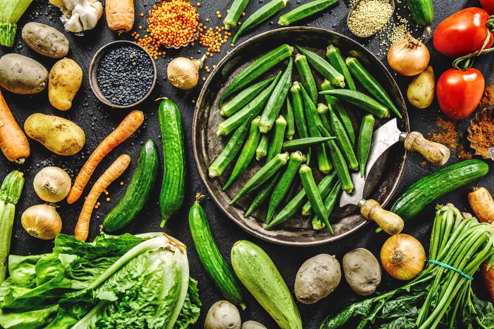 Healthy food background. Tasty variety of different vegetables on dark background. Flat Lay. Healthy Eating Vegan Vegetarian Concept.